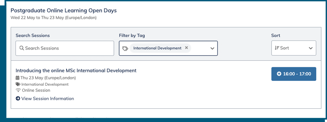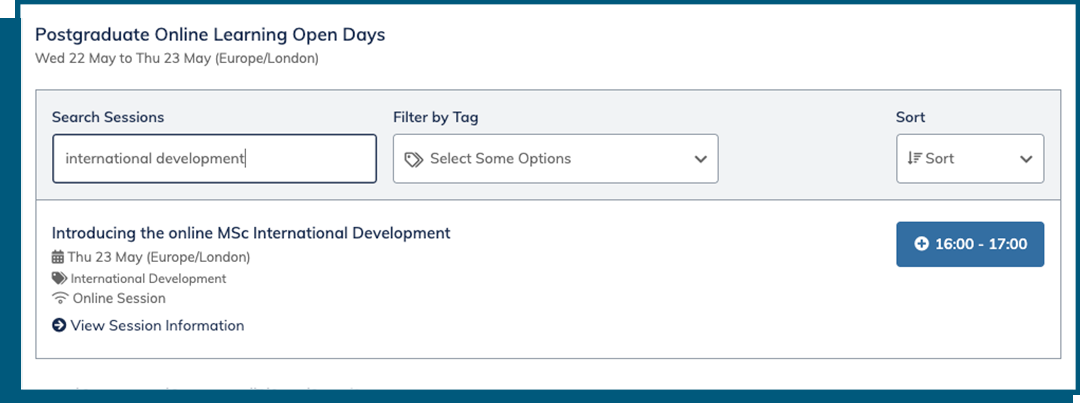 - Search for the full term 'International Development' in the 'Search Sessions' text box