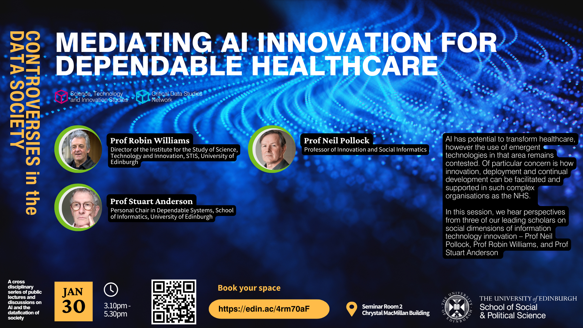 Robin Williams and Stuart Anderson will introduce the research they have been doing on information systems in the NHS. Robin will discuss the challenges surrounding safe deployment of medical AI, and Stuart will explore efforts to make medical AI more dependable.