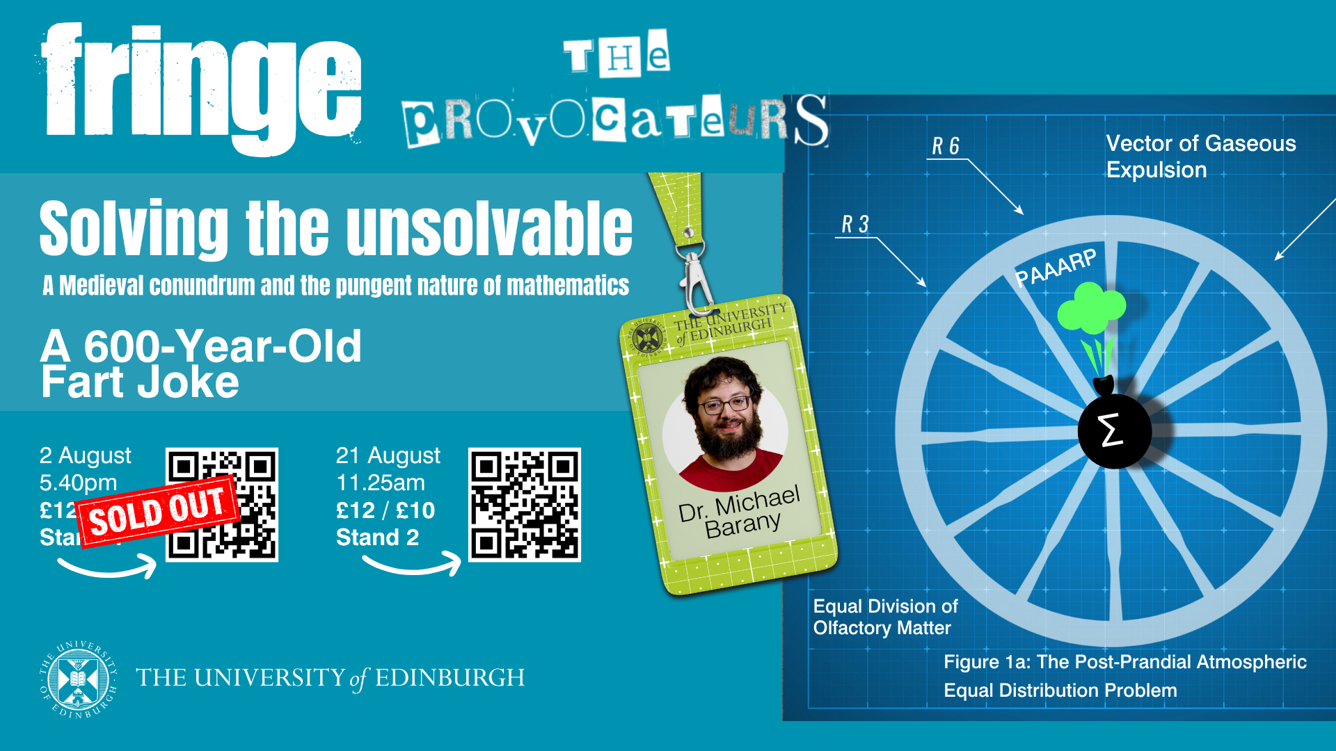 The Provocateurs:A 600-Year-Old Fart Joke / Talking to Machines. Hosted by comedian Sarah-Jane Judge. Dr Michael Barany (The University of Edinburgh) argues that a fart joke can explain the essence of mathematics. Dr Wataru Uegaki (The University of Edinburgh) dives into the weird overlap between human language and programming.