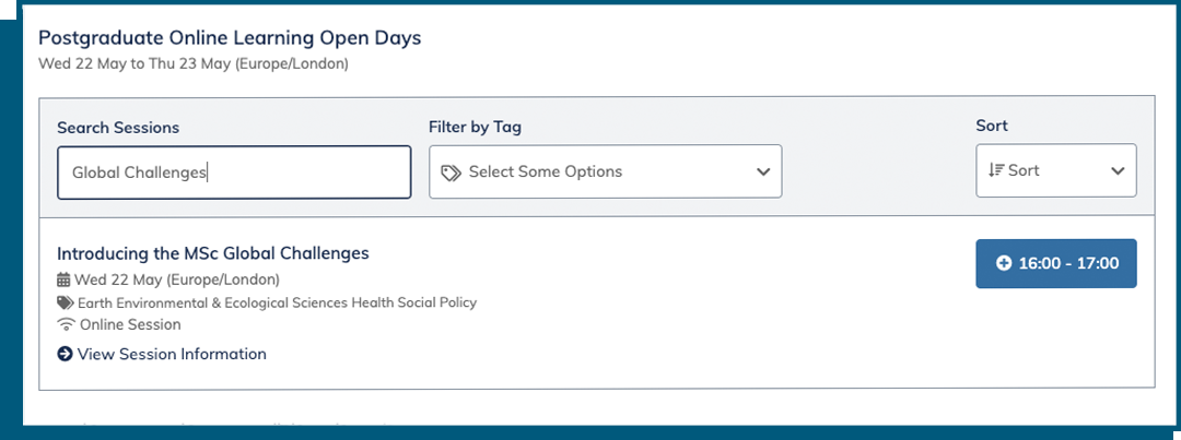 - Search for the full term 'Global Challenges' in the 'Search Sessions' text box